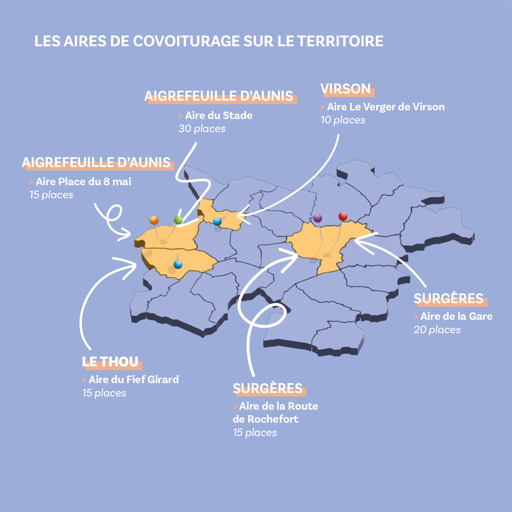Pour améliorer et faciliter vos déplacements, plusieurs aires de covoiturages sont aménagées sur le territoire. Ces parkings peuvent servir de lieu de rendez-vous ou de dépose, mais aussi vous permettre de stationner votre voiture dans un endroit adapté, si vous êtes passager. Le stationnement est gratuit et n’a pas de temps limité. Covoiturer devient plus facile !