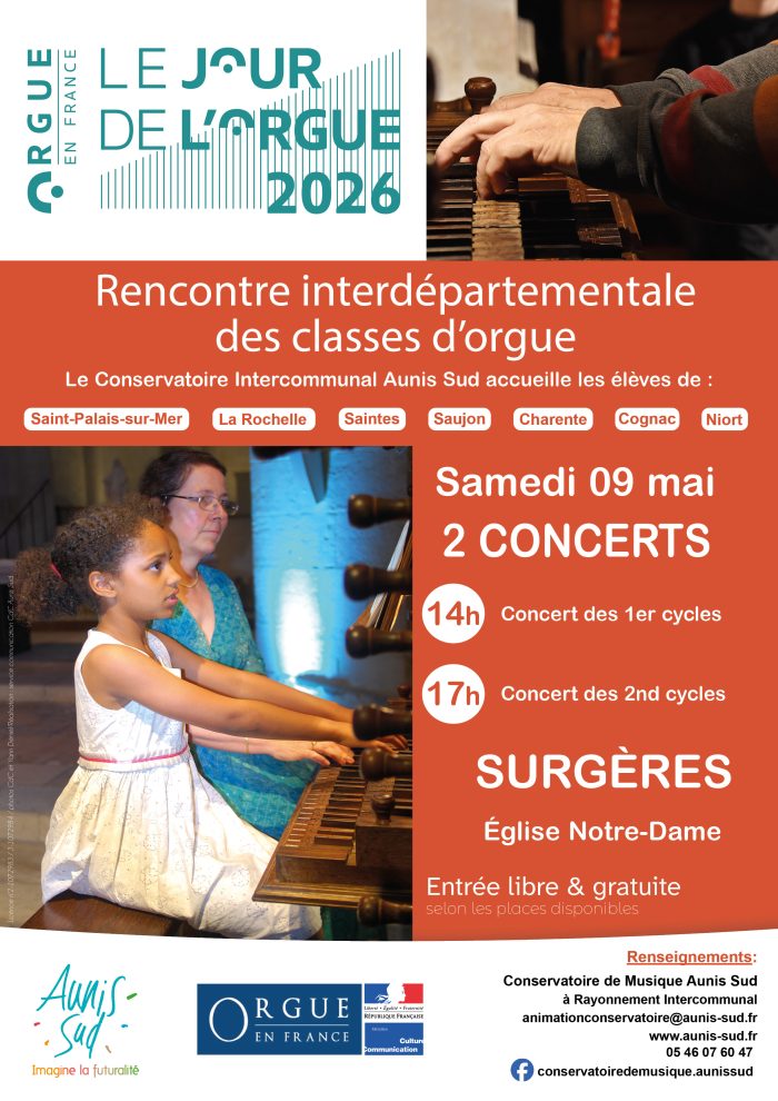 Pour l’occasion le conservatoire intercommunal de Musique Aunis Sud organise le samedi 09 mai une rencontre interdépartementale des classes d’orgue et accueille les élèves des conservatoires de La Rochelle, Saintes, Saint-Palais-sur-Mer, Niort et Cognac, de l’école de musique de Saujon et de l’école départementale de musique de Charente.