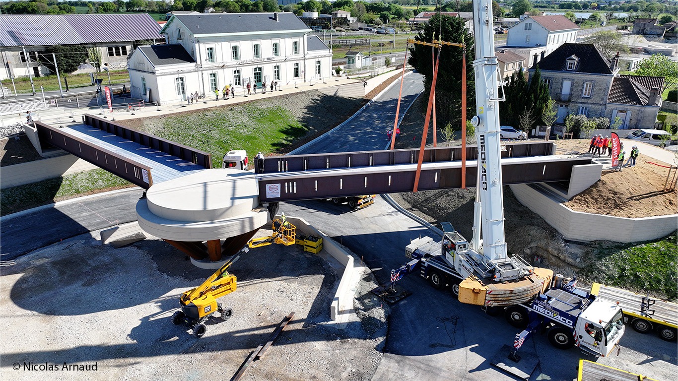Cet ouvrage, composé de deux travées de 40 tonnes chacune, relie désormais directement le parvis de la gare de Surgères au parking sud. Le respect du calendrier de cette opération technique spectaculaire marque le début de la phase finale de ce projet structurant pour notre territoire.