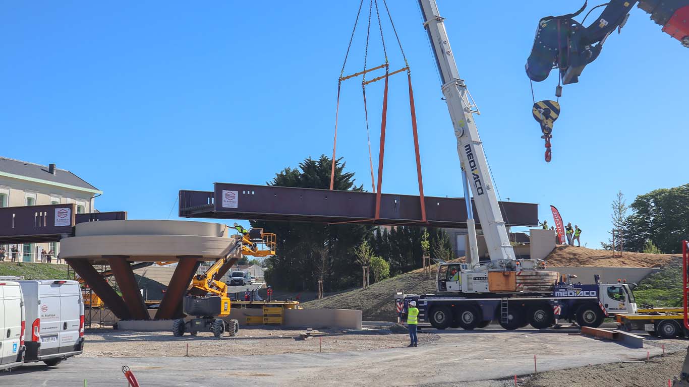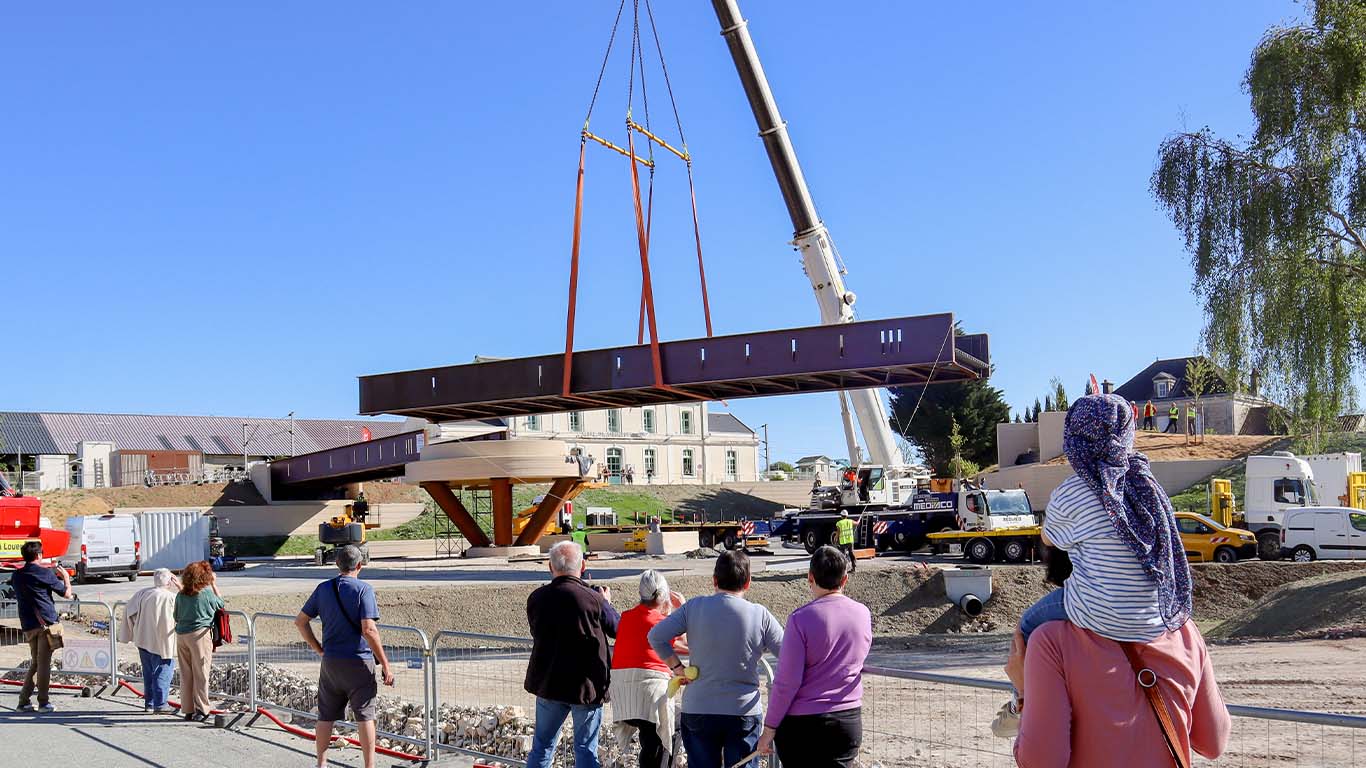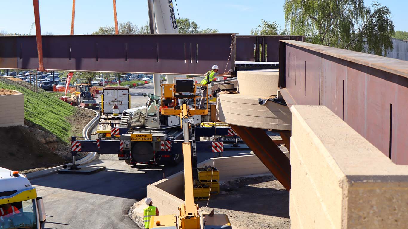 Bien que l’ouvrage soit désormais installé, il n’est pas encore possible de l’emprunter ! Les équipes entament maintenant la dernière ligne droite : les finitions (éclairage, rampes d’accès, sols) ainsi que les contrôles de sécurité réglementaires indispensables. Si tout se déroule comme prévu, la mise en service officielle de la passerelle est programmée pour le courant du mois de mai 2026.